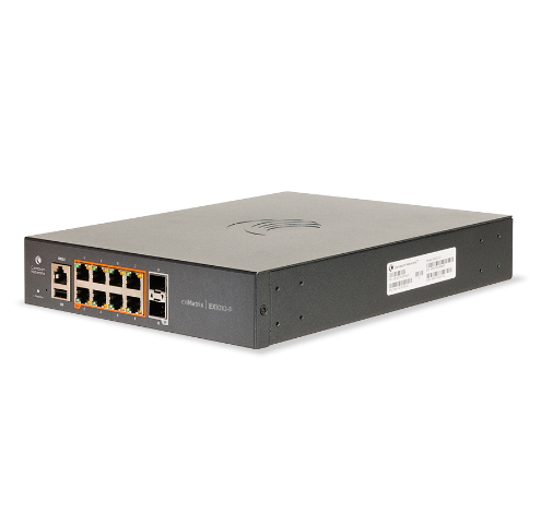 The cnMatrix EX1010-P is a configurable Gigabit Layer 2 PoE+ switch with eight Gigabit Ethernet ports - four of which are PoE+ ports with a total of 75W output power and two SFP uplink ports.