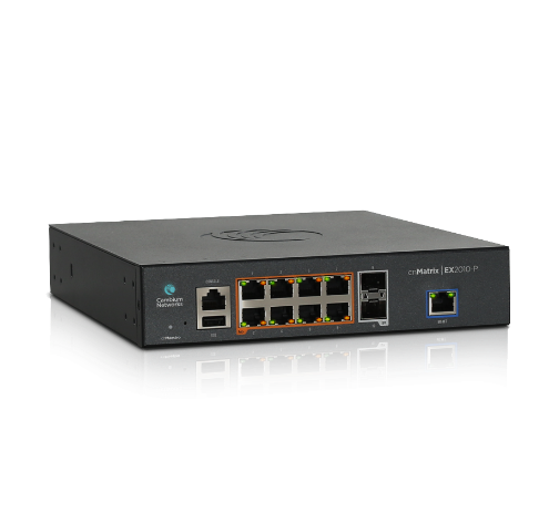 The cnMatrix EX2010-P is a configurable Gigabit Layer 2/3 PoE+ switch with 8x PoE+ Gigabit Ethernet ports - with a total of 100W output power and two SFP uplink ports.