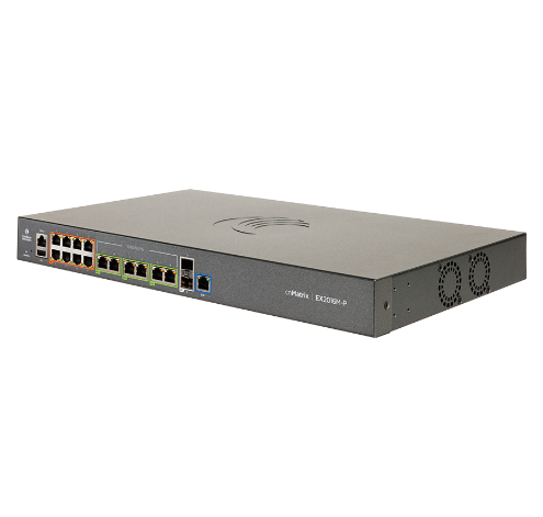 The cnMatrix EX2016M-P is a configurable Gigabit Layer 2/3 PoE+ switch with 8x PoE+ Gigabit Ethernet ports, 6x 2.5 G PoE++ ports - with a total of 240W output power and two SFP+ uplink ports.